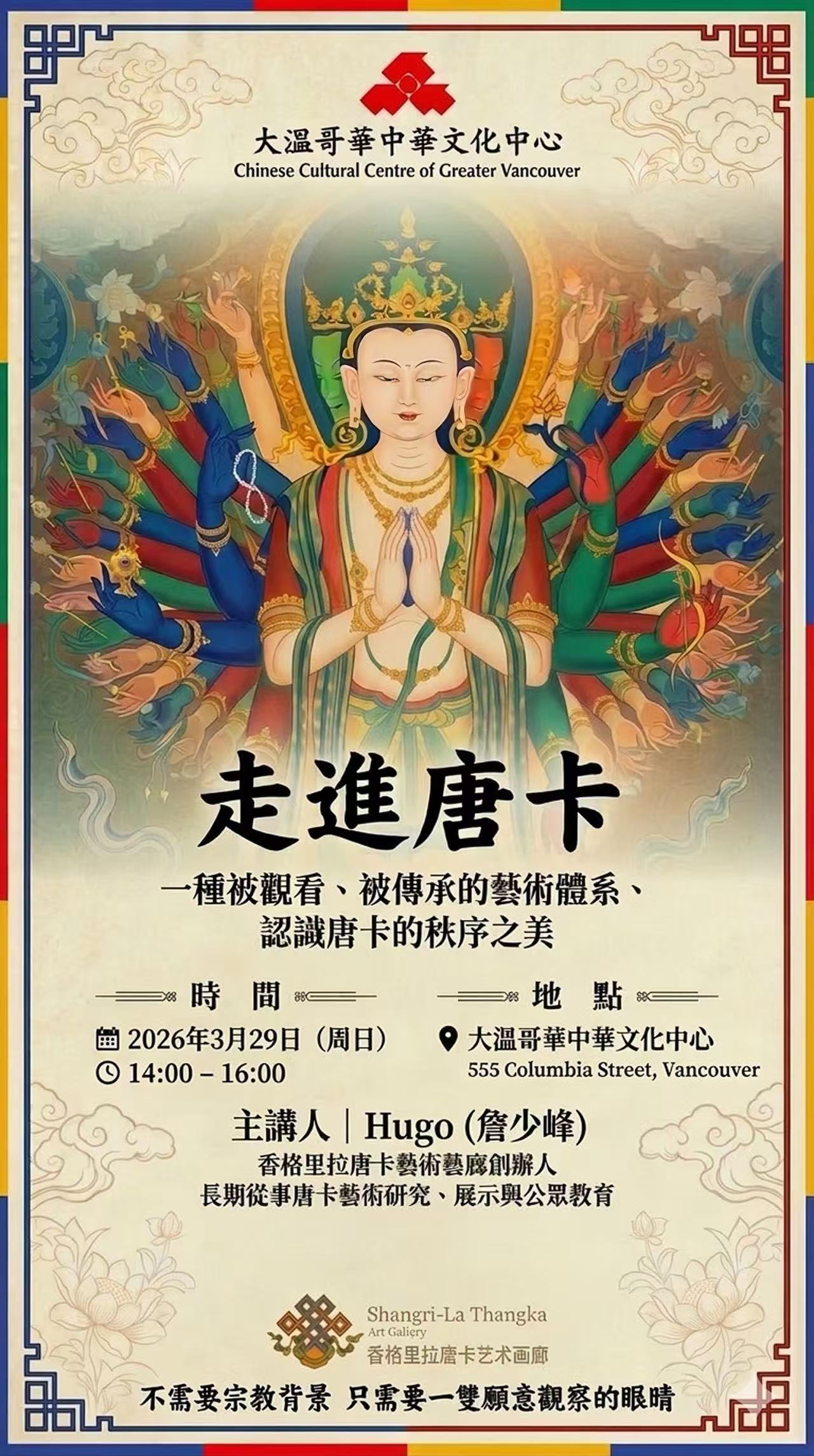 2026年3月29日下午,温哥华唐人街中华文化中心内座无虚席,一场题为“走进唐卡”的专题讲座在这里举行。讲座由王立博士主持,特别邀请香格里拉唐卡艺术画廊创办人、资深唐卡收藏家詹少峰(Hugo Zhan)主讲,通过通俗而深入的讲解,带领公众走近这一兼具宗教性与艺术性的传统绘画形式。